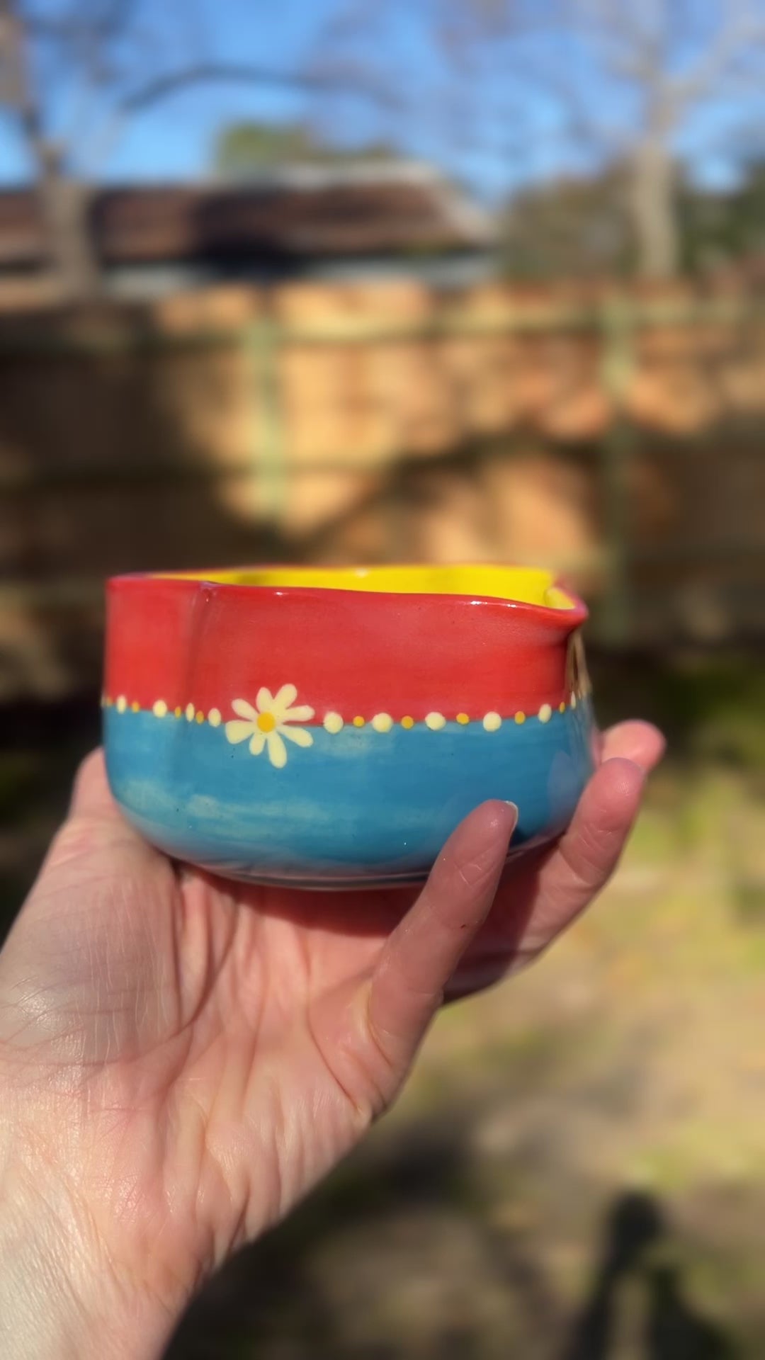 This little match bowl is hand thrown and painted. Dimensions are 2.5” height and 4” at its widest.
